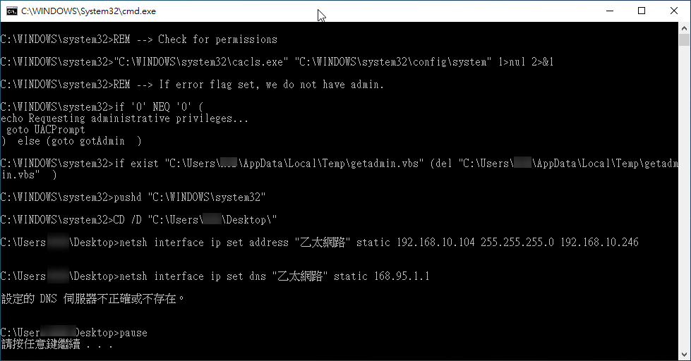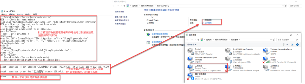 想要用Win10 執行靜態IP自動設定,因為常外出在客戶端環境,筆電要帶來帶去,IP也會時常更換,回到公司希望可以直接點批次檔就可以設定好。